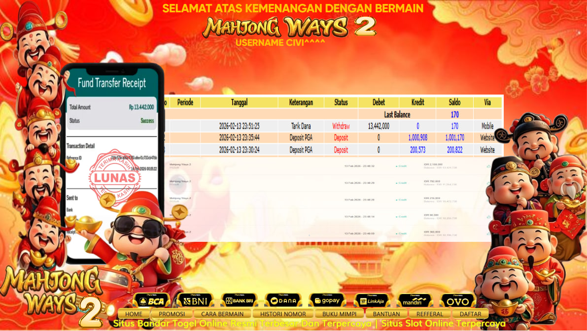 Bukti Pembayaran Kemenangan Rp.13.442.000 Juta permainan SLOT MAHJONG WAYS 2 USER ID:CIVI^^^^^^ LUNAS!